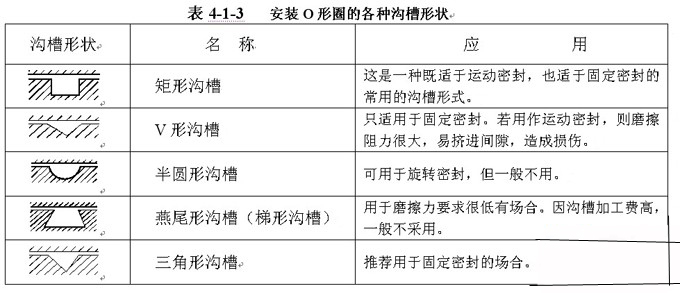 因?yàn)镺形橡膠密封圈是安裝在各種溝槽中使用,現(xiàn)將安裝溝槽情況列于表4-1-3。
