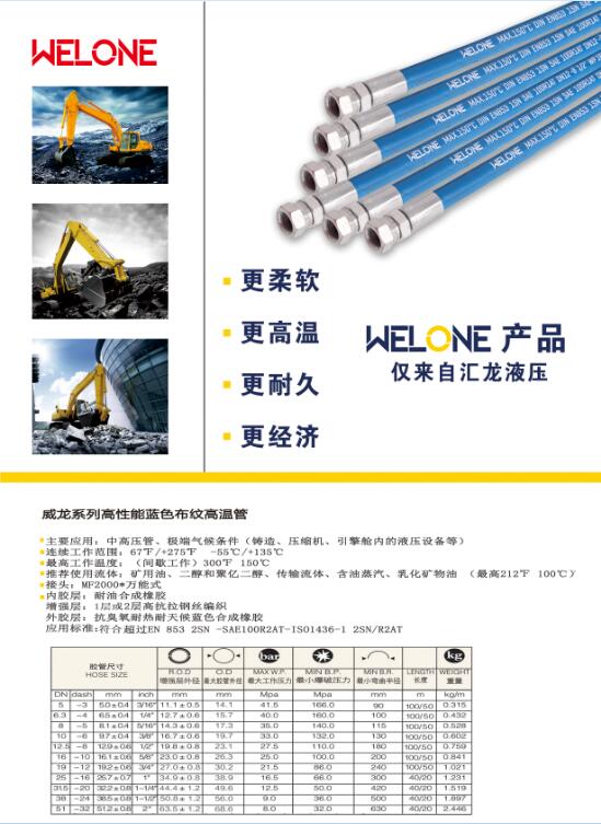 藍(lán)色棉線高溫管壓力符合及超越SAE標(biāo)準(zhǔn)·耐溫度范圍更大·具備突出的持續(xù)性耐高溫和抗紫外線特點,廣泛用于工程機(jī)械等行業(yè)。