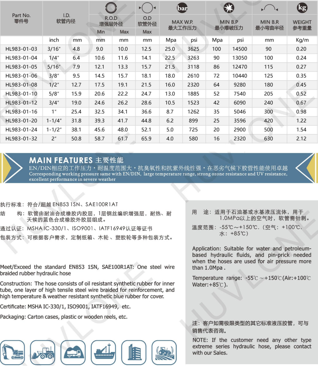 Meet/Exceed the standard of EN853 1SNSAE 100R1AT One steel wire braided uber hydraulic hose with high & Low temperature - resistance