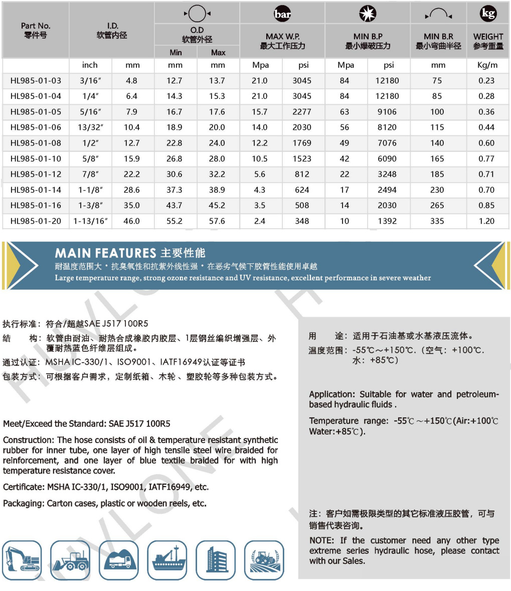 Meet/Exceed the standard SAE 517 10OR5: Single sleel wire braied,terxile covered hydraulic hose with high & Low temperature - resistance
